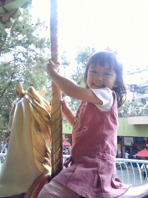 3歳になったので、一人でメリーゴーランドに乗れるようになった。一人で乗れることにご満悦のご様子。ここの遊園地は入場料無料なのでちょくちょくくるんだけど、単発の乗り物が高い!!メリーゴーランド1人600円也。200円か300円なら、もっとのせてあげられるのに・・・あーちゃん、スマナイ
