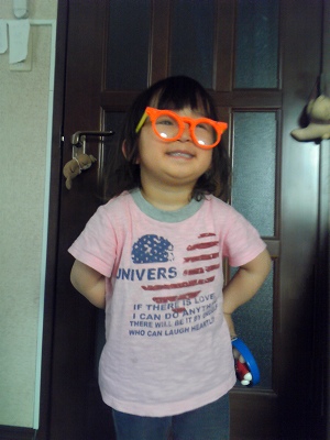 おもちゃの眼鏡をかけたあーちゃん。アラレちゃんに似てると思うのは私だけかしら?