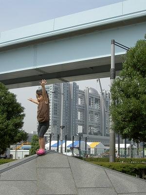 お台場の横丁にて、ど根性カエル発見お天気が良かったので、海がキレイでした。最近のキメポーズはモッパラこれ