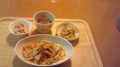 今夜は、ほうとう、おから、煮物、レンコンサラダ。あまりにも地味料理ばかり揃えたので夫には不評かも?でも野菜を沢山食べられたので、妊婦としては満足、満足。