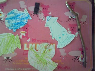 出掛けられない日が続き、色々工作してみた。これは磁石を小枝につけて、魚釣りゲームつもり。これはレジのつもり。工作ってなかなか楽しいかも
