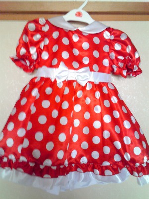 最近、ミニーちゃんブームのあーちゃん。ねだられて、ついつい買ってしまったさっきお店で試着したばかりなのに、着たくてたまらない様子・・・早くこれを着て、ディズニーランドに行きたいね。