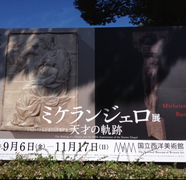 フィレンツェに、カーサ・ブオナローティというミケランジェロの自宅を美術館にした場所があるそうで、その所蔵品が来ている。ミケランジェロは油彩画を残していないため、今回の展示はシスティーナ礼拝堂のフレスコ画を作るための習作が多く、目玉は写真のマリア彫刻とキリスト磔刑の木像彫刻、それと下の写真のクレオパトラの鉛筆画か。 これでは企画展示として弱いのだが、天地創造の天井画と最後の審判の壁画を4K映像で撮影し、250インチ画面に映像を投影しているコーナーがあり、そこそこ満足度を上げる工夫がされていた。