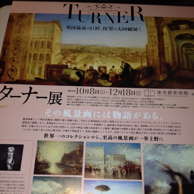 会期終了が近づいたターナー展に行った。ターナーはイギリス史上最大の画家と言ってよいだろう。正確にはジョゼフ・マロード・ウィリアム・ターナーという。理髪店の子供に生まれ、小さい頃からこぼれたコーヒーを指に付けて天才的な絵を描いていたらしい。父親は幼いターナーが描いた絵を理髪店の窓に貼り、数シリングで販売していたともいう。 本展にはとても沢山のターナー絵画が来日している。ファン必見の展覧会だ。