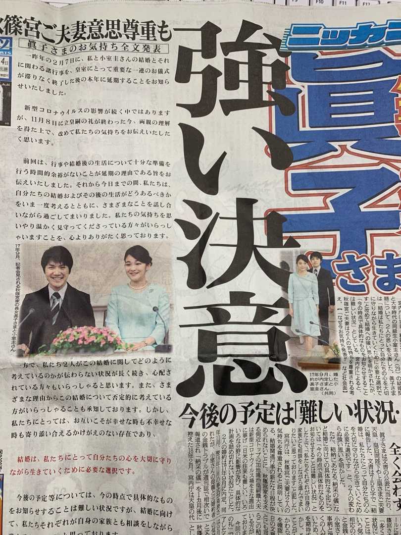 秋篠宮様の立皇嗣の礼は11/8に滞りなく行われたが、それを終えて、今このタイミングで眞子様の延びていたご結婚を、満を持して発表したのである。