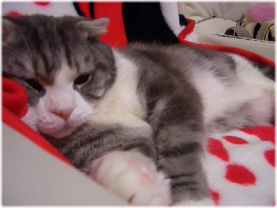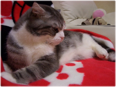 うちは子供がいないので、ひな祭りは特になにも予定していませんでしたが、叔父がケーキを持って遊びに来たので写真を撮ってみました小さなケーキにボンボリ型のローソクでかわいい中にはイチゴムースがぎっしり詰まっていて、真ん中にはチョコレートクリームおいしくいただきました。ニャンコの香箱座りと言われるものを、シェイトがやっていたので写してみたのですが何か変???普通左右片方ずつを丸くして中に入れて座るのでは?シェイトのは、どう見ても手がクロスしてる・・・。手が大き過ぎて入らないのかな?