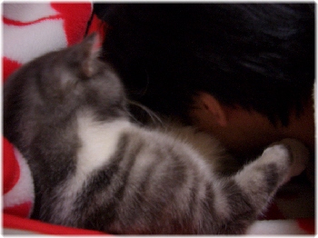 私は、ペットロス症候群でした・・・。急性腎不全と心臓病を患い、半年間の闘病生活の末、尿毒症で亡くなりました。たった四年の一生でした。今まで色んなペットと暮らした事は、あったのですが病気でこんなに短い命だった子はいなかったのですごくショックで・・・。あまりの落ち込みようを見て、今の旦那様が毎日野良にゃんこを捕まえようと追いかけていたそうです。(^^ゞでも捕獲出来ず。。。ならペットショップへ触りに行こうと半分強引に連れて行かれ。。。(=^ェ^;=)気乗りしないまま行ってみると、一匹のニャンコが目にとまりました。大きなペットショップで、何十頭といるニャンコの中から一匹。狭いガラスケースの中に、水の容器と三角のトイレが入れられそこにいるニャンコを見るとこんな格好で寝てたんです!!!トイレの中で!抱っこさせてもらい、ケースへ戻すと『ミャ~!』って出てきました。そしたらもう戻せなくなって・・・。旦那様の顔を見てみると『連れて帰ろう!』って。帰りの車の中で、シェイトと名前を付けました。漢字は、聖斗!(意味は聖なる遣い!?( ̄(エ) ̄) )そしてすぐに健康診断を受けに病院へ行きました。するとビックリ!耳ダニ・寄生虫・皮膚病・白癬菌etcに感染・・・。またまた病院通い生活になりました。 でもあのままペットショップで、白癬菌の症状が出ていたらどうなっていた事かと恐ろしくなります。何かご縁があったのですね~~。( ^ ^ )うちに来て10日目右手の毛が菌に侵され、抜け始めその後全身に飛び火にゃんこブログランキングに2つ参加しました。よろしければ顔をクリックお願いします。