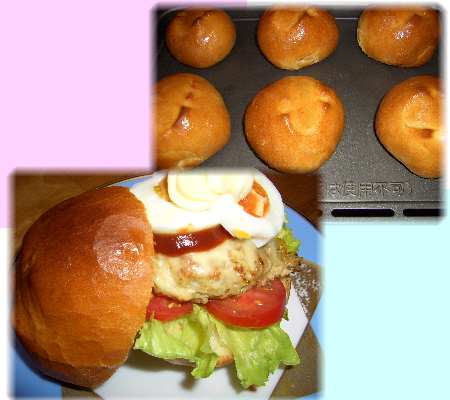今日はこれを作ってたので、偉い時間がかかりました!(^^ゞパンもそろそろ、うまく作れるようになってきたので、ちょっとアレンジ巨大ハンバーガーです。パンは、この前レシピをいじっておいしかったので そのままの配合!けど、丸いパンを作った事がなく、『これそのまま丸めていいのか?』『知らないし~・・・。』(^^ゞとりあえず、のばしてグルグル~て二回ほど巻いて、それから丸めました~。そう!もうお気づきですか???私って適当~~が好きなのです。それから、ハンバーグをコネて とろけるチーズをのせて焼きましたソースは、生のトマトを裏ごしして、ブイヨンと市販のソースで味を整えあとはトッピング~レタスとトマト・ゆで卵をはさんで、巨大ハンバーガーの出来上がり~~!v(≧∇≦)v ♪一個でお腹いっぱぁ~い。 (6個もあるけど・・・。^^;)おいしいよ~~!o(*⌒―⌒*)o♪ふぅ~~!けど今日は疲れた。『シェイト食べないかい?』『おで カリカリが好きにゃ~~!』だよね~~~!(^^ゞにゃんこブログランキングに2つ参加しています。よろしければ顔をクリックお願いします。