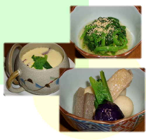簡単レシピ構築中☆彡デジカメ返ってきました~!(@^∇^@)最近旦那様が、お疲れのようなので、野菜中心料理を作ってみました♪ ほうれん草のお浸し・茶碗蒸し・鶏と小芋の煮物(小芋、茄子、鶏、こんにゃく、菜の花の葉)全部別出汁で作りました。茶碗蒸しには、日頃使う魚介類を、少しずつ冷凍しておいた物を使用。彩りが悪かったので、菜の花の葉をのせました。写真撮りって難しいですね・・・。あとこれの他に、鶏の塩焼きと魚があったのですが、撮っている時間が無かったのでカットです。(^^ゞ毎日少しずつ写真を撮って、簡単レシピを作ってみようと思います。旦那様は『うまい!こうゆう物が、うまいと思うようになったという事は年をとった証拠かな・・・。』とか言ってました・・・。『オデは、まだ若いにゃ~!』にゃんこブログランキングに2つ参加しました。よろしければ顔をクリックお願いします。