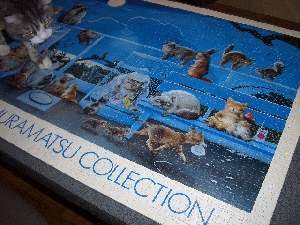 今日は実家の片付けと、新居の配置決めに行ってきました。それにしても暑い。。今年一番の猛暑で、線路が熱で変形したんですってね車で移動中も、エアコンが追いつかないくらい暑かった(ノへ^)新居なんて、まるでサウナ状態引越しまであと五日怖すぎるww実家には学生時代作ったジクソーパズルがたくさんあり、殆どは処分しました。でもこの一枚だけはどうしても捨てられず、とりあえず持って帰って直す事にしました別に難しい絵ではないけど、完成までに1年かかったこのパズル。猫満載の2000ピース!(邪魔かな??)枠を外して、綺麗に拭いてのりを塗り直していたら。。奴がやってきたww・・・。塗りたて注意『 ニャ?オデのお友達? 』『 ねぇねぇ 遊ぼう』えwwん(;´д` )のりに肉球の跡がついたよww。。