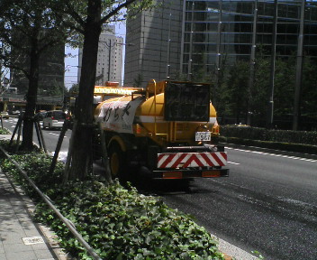 今日も暑かったようです。帰りの電車から日記です。 昼間、いつものように、会社の近くを散歩していたら、黄色い散水車が、最後部から、じゃばじゃば水を放出しながらゆっくり走っていました。 いえ、じゃばじゃばというか、、、、どぼどぼ、という感じです。 なお、写真は先週撮影したもので、水は出ていません。 水が出るときは、撒くというか、漏らしながら逃げる、といってもいいです。 もう少し、優雅に、そうですね、、、噴水のようにまいてほしいのですが。 そのときに、小さな虹でもかかってくれれば、なお、いいのですが。 そうも、いかないのでしょうネ。 さあ、今週もあと4日です!?
