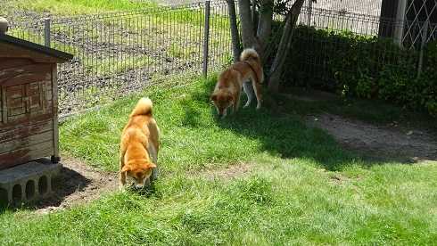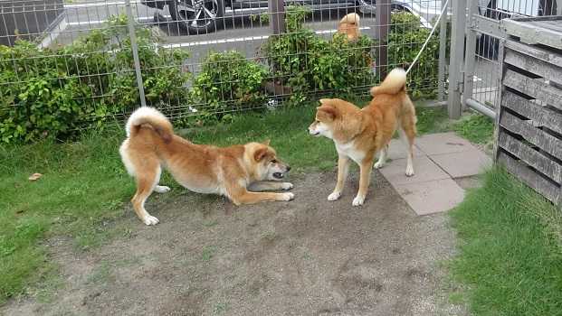 2日前のひとコマ。この日は昼下がりの庭遊び時に初めてチコの遊び相手にカイを向かわせてみることとしました。暴れん坊なカイが狼藉を働きやしないか??そんな警戒感を持って二匹の傍にはナナ、そして遠目に状況を俯瞰する様に大目付役の結がその様子を見守る中、チコとカイの庭遊びが始まります。カイにも引けを取らない程の恵まれた体躯で正面切って肉弾戦を繰り広げて見せたかと思いきや、お父ちゃんの紅丸号譲りの強靭な足腰を活かしながらカイの反撃を往なすや追いかけっこに誘う動きを見せるチコ。思わぬつわものぶりを垣間見せるチコを前にお持ち前の闘争本能に火が付き、カイもまたぐんぐんギアを上げていく様子が見て取れるようです。(楽)またその一方で、そんなカイの様子を察した様に二匹の間に割って入り、何やらチコに忠告でもしてくれているかの様な仕草を見せていたナナ。ヒートアップしやすいカイの性格を熟知しているナナは、遊びの中で必要以上にカイを刺激することの無い様に可愛い娘の元へアドバイスに走っていたのかもしれないですね。(楽)そんなナナの意図を汲む様に、その後も状況に応じてカイに主導権を譲る寛容さも覗かせていたお利口さんなチコ。その様子を確認したかの様に二匹の空間を後にすると、「結姉ちゃんにもお守り役をさせてしまったりとお手数を掛けたわね。でもあのふたりは多分、これで大丈夫だと思うわ♪」って感じで結のもとへと向かうナナの姿が印象的なひとコマとなりました。こちらは、攻守の切り替えを柔軟にこなしてみせるチコのお陰で楽しい雰囲気で初めてのチコとカイの庭遊びがひと段落した様子を撮ったひとコマ。チコを前にして「チコ、お前、なかなかやるな~♪」って感じで久々に骨のある相手との遊びを満喫した様子を見せるカイに、「うちのバカ息子相手に最後まで自分を見失うこと無く、立派だったわよチコ!あなたの姿をマリ大婆ちゃまが見ていてもきっと同じ様に褒めてくれると思うわ♪」とでも伝えている様にも見えてしまう結の姿もまた印象的なひとコマとなりました。(楽)その後、庭番役をこなしながらのんびりとした昼下がりのひとときを仲良く満喫する様子をみせていた結ナナコンビ。程なくしたところで、そんな結とナナがデッキへと移動したところで、カイのリクエストにチコが応じるかたちで庭遊びの第二ラウンドのゴングが鳴ります。体幹の強さに加え、バネの効いた足腰の強さは我が家の面々に引けを取らないものを感じさせるチコ。その分、見守るこちらにとってもまた、二匹の遊びは一層激しいものに見えてしまいます。ご家族の愛情に包まれながら、群れの感覚を失うことなく、持ち前の強くて優しい内面性もしっかりと成長させて今回、我が家へと里帰りしてきた様にも見えてしまうチコ。二匹の遊びの様子を眺めていると、こうしたファミリーと共有する時間を通して若いカイを始めとする我が家の面々もまた成長する機会を得ている様な気もしてしまいます。(楽)この日の夕方、我が家での合宿期間を終えて、パパさんそしてママさんと帰宅の途に就いたチコ。チコ、今回の里帰りでお兄ちゃんのリクに会えたことに加えて、初めて妹の楓にも会えてホントに良かったね。そしていつか弟の悟空にも会える日が来るといいね。また、いつでも遊びにおいでね!チコがやって来るのをナツナナ結、そしてカイとともに楽しみにしているからね!!