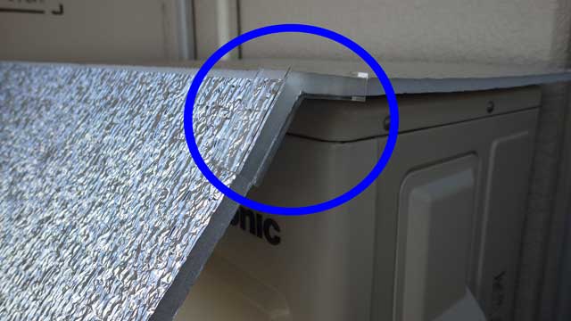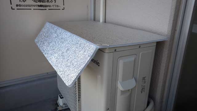 もう9月なので本来の成果を発揮する時期を過ぎてしまいましたね〜。朝日は兎も角として、日中の日差しによる室外機の温度上昇を抑えてくれると、期待大です。室外機の天板を綺麗に拭いて、シートに付属のマグネットで貼り付ければほぼ工事は終了。斜めのアングルを固定する治具を取り付ければ完了です。台風などの大風が吹くときは、ホームセンターで売っているような荷造りテープで固定すれば、大丈夫でしょう。  もっと詳しく見る