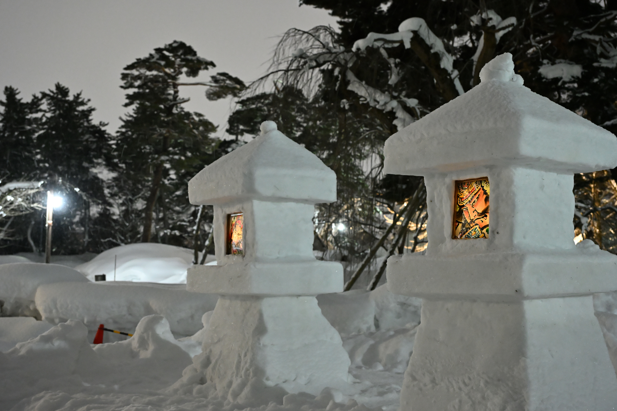 お濠に飾られてた金魚ねぷたも雪被ってます。