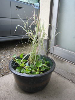 ず~と前から欲しかった「睡蓮鉢」を買いました予算の都合上小さい鉢になりましたが・・狭い玄関先にはこれ位がよいかも・・とりあえず、葦とホテイアオイを入れていますが近々睡蓮を購入する予定。(本当は鉢を買った時に一緒に買いたかったのだけど、予算が足りなかった) そして・・ めだかを5匹ほど中に入れてみました。なんだかかわいらしくて・・自己満足です。先日、遊びに来た孫のない君も「とっと~」と喜んでたし さて、そのない君ですが地元のTV局のアレすけが気に入ってしまい・・「たったった アレすけ」をパソコンでみながらずっと踊ってる・・パソコンを開くと走ってきて、かけろ!っと言わんばかりにちょこんと膝に座るし・・・大阪に帰ってからも、機嫌が悪くなってもアレすけを見ると泣き止むらしい・・・娘1号に、大阪でも流行らせてね~と言うと笑ってましたわ