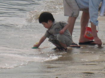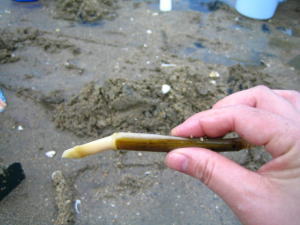 潮が良かったので、沙美海岸へ潮干狩りにいきました。 ない君、初めての海です。少し怖がるかなと思ったのですが・・・・ 怖がることなく、海を満喫。顔までどろどろ・・とても楽しそう(^^) ない君は、水遊びを楽しんでる間に他の人達は貝堀り・・・成果は バケツに2/3ほどマテ貝が取れました。本来の目的だったアサリは少しだけ(^^;)とりあえず、茹でて小分けにして娘1号に持たせてあげました。酢味噌で和えたり、さっと煮付けて天ぷらにしたり・・見かけは悪いけど美味しい貝です。