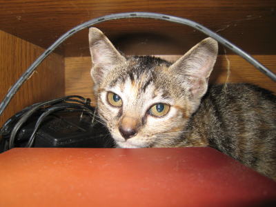迷い猫・・チビことちーたんです。 この間、華ちゃんが勝手にお散歩(家出)に出てしまい2日後に帰って来たと思ったら仔にゃんこの姿がちらほらと・・・華ちゃんの声に反応してニャーニャー鳴いています。ちらちらと姿は見えますが、人の姿をみると逃げてしまうし・・・3日ほど家の周りをうろついていたのですが、どんどん声が弱ってきている様子・・・どうるすべ~と思っていたら、朝ピンちゃんが窓の外を見ているので見てみると仔にゃんこが窓のすぐ下に座ってる・・・旦那さんが少し窓を開けても逃げない・・・入れるくらい開けると部屋に入って来た!そこをすかさず、保護いたしました。ガリガリだし・・・。保護したもののさてどうしよう??我が家も3匹の猫さんたちがいるしそうでなくても、海ちゃんはシャーシャーとかなりお怒りのご様子・・・。華ちゃんも怒ってる・・・あんたが連れてきたんでしょうが!!かろうじてお世話猫のピンクさんだけ友好的だ。 とりあえず、太らせて、人に慣れさせてからペットショップにお願いして里親探しするかな・・・・。