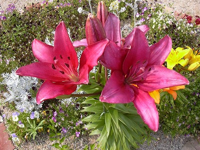 2日ほど家を空けておりました。ただいま帰ってきました。 早速、庭に出てみました。案の定、草花がぐったりしていました。1時間ほどかけて水遣りをしました。この季節、やはり毎日水遣りが必要かもしれませんね。 前にオレンジ色の透かしユリが咲いていましたが、新たに黄色とワイン色の2種類の花が咲いていました。ワインレッドのユリは昨年に比べ花が大きいようです。 ユリは水をやってなくても元気ですね。安心しました。******************************* ★★★★今日の日記いかがでしたか? ガーデニングの人気ブログランキングに参加しています。よろしければ下記の画像をクリックしてくださいね♪↓↓
