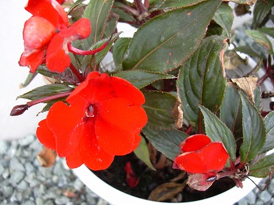 今も大変強い雨が降っています。最近の天気は異常ですね。降るときは集中して降ります。おかげで庭作業はなし。お花の話題もありません。サッカーも負けたし、ジャイアンツもぼろぼろだし、まったく元気が出ません。 ニューギニア・インパチェンスの赤い花でも見て元気出しましょう。このはなはニューギニア高地の原種をもとに育成された温室鉢花で、夏の高温や直射日光および冬の低温に弱い植物です。ちょっと気難しい花のようです。半日陰で水を絶やさずに育てて見ます。******************************* ★★★★今日の日記いかがでしたか? ガーデニングの人気ブログランキングに参加しています。よろしければ下記の画像をクリックしてくださいね♪↓↓