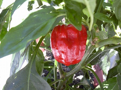 今日も朝から熱気ムンムン! セミの声もガンガン! やっぱ夏ですね。自然と心がうきうきします。 さて、ピーマンを作っています。緑色のピーマンが収穫できていましたが、突如、赤いピーマンができていました。熟れすぎたのかな。食べてみようかな。不思議です。 ラティスにハンギングしているアメリカンブルー、花数が増えてきました。ラティスに飾る花も少ないので人形をぶら下げています。どうかなぁー。 この時期、庭の草花の水遣りも大変になってきました。夕方には萎れています。アメリカ産の牛肉も輸入開始とか・・・。とても食べたいけれど、少し不安です。皆さん、アメリカ産の牛肉食べますか? ****************************** ★★★★今日の日記いかがでしたか? ガーデニングの人気ブログランキングに参加しています。よろしければ下記の画像をクリックしてくださいね♪↓↓