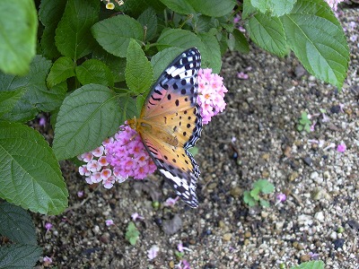 今日朝方、大雨。その後徐々に回復してきました。そのまま梅雨明け宣言してほしいです。 こんな中、最近庭にはトンボや蝶がたびたび訪れてきます。 ランタナにとまった蝶。偶然撮影できました。蝶にとってランタナは相性がよいようで人気の花です。今咲いている花がランタナだからかな。 そろそろ梅雨明けでしょうね。それはそれでまた暑いのでしょう。でも、我慢、我慢。やっぱり雨よりは晴れたほうがいいよね。 ****************************** ★★★★今日の日記いかがでしたか? ガーデニングの人気ブログランキングに参加しています。よろしければ下記の画像をクリックしてくださいね♪↓↓