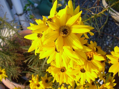 いい天気ですね。秋空がきれい。 このような日に光っている花はヘリアンサスです。ひまわりのミニです。キク科ヒマワリ属で 多年草・耐寒・耐暑性ともに強い。申し分のないお花です。 花期は7~11月と花数が少なくなってくるこの時期にもってこいのお花です。 このヘリアンサスを使って寄せ植えをしてみませんか。これはヘリアンサス、その横にビデンス(ウインターコスモス)、左前にもみじ葉ゼラニュウム、その横に白妙菊をアレンジしています。ちょっと秋の雰囲気が出ているでしょうか。 今日もご訪問ありがとうございました。今日の日記いかがでしたか? ガーデニングの人気ブログランキングに参加しています。よろしければ下記の画像をクリックして帰ってくださいね♪↓↓