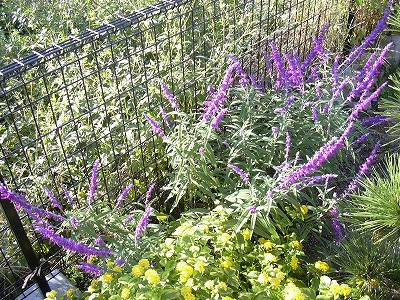 日に日に暗くなる時間が早くなってくるようです。18時にはもう真っ暗ですね。でも日中はまだまだあったかいです。 我が家の庭ではアメジストセージが最盛期を迎えています。花は紫色ですが、萼も紫~ラベンダー色をしており、これがとても鮮やかで目を引きます。今年鉢植えから地植えにしましたが、繁殖力は旺盛でみるみるうちに大きくなってしまいました。葉は長披針形でさ10cm程度です。 そして、それにも負けないぐらい頑張っているのが班入り葉の黄色のランタナです。両方が旺盛なのでとうとう込み合ってきました。 両方の花を見ているとなぜか元気が出てきます。ちょっと秋というイメージではありませんね。 今日もご訪問ありがとうございました。今日の日記いかがでしたか? ガーデニングの人気ブログランキングに参加しています。よろしければ下記の画像をクリックして帰ってくださいね♪↓↓