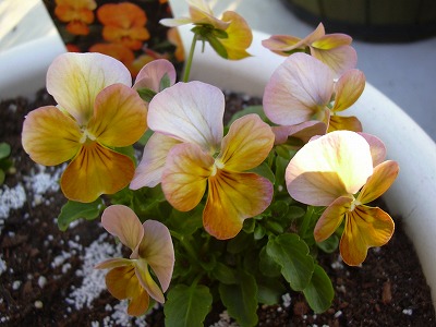 今日は一日晴れたり曇ったり雨が降ったりと不安定な一日でした。最近、ビオラにはまっています。というかほかにそれに勝る草花はないのが正直なところですね。 今日のビオラは、「アプリコット アンティーク」です。オレンジ色とサーモン色がうまくミックスしています。他の品種に比べると花数が多いかな。花色も確かにアンテイーック調ですしね。 ほんとビオラにはいろいろな品種がありますね。目移りしちゃいそうです。 今日もご訪問ありがとうございました。今日の日記いかがでしたか? ガーデニングの人気ブログランキングに参加しています。よろしければ下記の画像をクリックして帰ってくださいね♪↓↓パンジー・ビオラ セレクション ハンギングバスケット セレクション