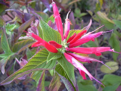 今日は久しぶりに秋晴れ。徒長した苗たちに太陽のシャワーを浴びせる絶好の一日でした。といって徒長苗は徒長したまんまですけどね。 庭にはハーブだけ植えている一坪ほどのコーナーがあります。そこではセージたちが花を咲かせています。 まずは今年初めて花を咲かせたパイナップルセージです。パイナップルセージは、宿根サルビアの仲間で、サルビアエレガンスと呼ばれることもあります。秋の時期によく咲きます。 名前のとおりパイナップルに似た甘い香りを持っていますので、ハーブティになどに利用できます。 次に時々登場するチェリーセージ。春から秋の長期間咲き続け、丸く唇形をした赤い(チェリーレッドの)小花を咲かせる半耐寒性宿根草(ハーブ)です。チェリーフルーツの香りがあるのでこのような名前がついているみたい。 どちらも宿根草なので毎年楽しめます。それに独特のフルーティーな香りもしますしね。ぜひ植えてみてください。 今日もご訪問ありがとうございました。今日の日記いかがでしたか? ガーデニングの人気ブログランキングに参加しています。よろしければ下記の画像をクリックして帰ってくださいね♪↓↓