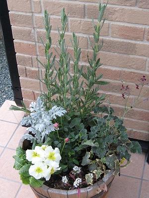 今日の朝は曇っています。最低気温は0℃と今年一番の冷え込みかもしれません。 昨日は、午後から久しぶりのガーデニング、種から育てているデージー、ネモフィラ、スィートアリッサム、ビオラやパンジーの植え付けをしました。これらの苗はビニールポットは小鉢に植えつけたまま放置状態でした。早く大きなところに植えようと思ってたのですが、やっと実現できて一安心です。 そして、夕方近くから思い立って今年初めての寄せ植えづくりをしました。用いている素材は、後列から、デンタータラベンダー(フリンジドラベンダー)、イングリッシュゼラニュウム(ぺラルゴニウム シドイデス)、白妙菊、ミニバラ、前列にプリムラポリアンサス、スィートアリッサム、ヘデラです。 今開花しているものは、白色の花をつけたポリアンサス、ワインレッドの花色をつけたぺラルゴニウム シドイデス、白色の花をつけたスィートアリッサムです。この中でも濃いワインレッドの花色のぺラルゴニウム シドイデスは魅力的です。長い茎の先に1.5センチほどの小さなお花を咲かせています。ミニバラなど開花すれば全体の雰囲気も変わってくると思います。ラベンダーの開花はもう少しあとになるでしょうか。紫色の穂をつけてくれることでしょう。べラルゴニュウム今日もご訪問ありがとうございました。今年もガーデニングの人気ブログランキングに参加しています。 よろしければ下記の画像をポチットして帰ってくださいね♪↓↓