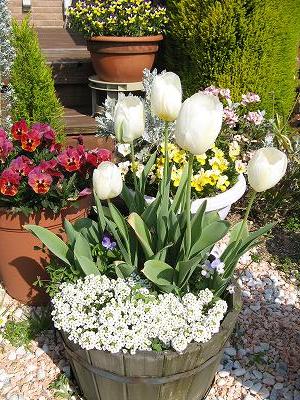 本日もご訪問ありがとうございます。 今日は午後から良い天気になりました。桜も今日が見ごろの最後で、大勢の花見客が各地に出かけているそうです 風が強いので桜吹雪が舞っています。きれいです。 さて、以前、植えっぱなしのチューリップにスィートアリッサムを前面に植え付けましたが、アリッサムもこんもり広がってきました。 チューリップの開花ももうすぐです。結果的にはホワイト系の寄せ植えに仕上がりそうですね。 今日は何の日?ご覧になりたい方はクリックしてくださいね! 6日の天気予報 気温8~17℃ 今日もご訪問ありがとうございました。 ガーデニングの人気ブログランキングに参加しています。 よろしければ下記の画像をポチットして帰ってくださいね♪↓↓