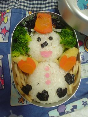 今日次男の幼稚園に姉妹都市をしている日本海側の町から雪が届くはずでした。でも暖冬でトラック2台分の雪が確保できず結局1クラスに発泡スチロール2箱分の雪と特産品の醤油と竹炭とおまけにチョコが届きましたで、今日は 『雪ダルマ弁当』完食して帰ってきてくれました。毎日すごいキャラ弁のおかあさんって本当すごいって思う。真似できな~い