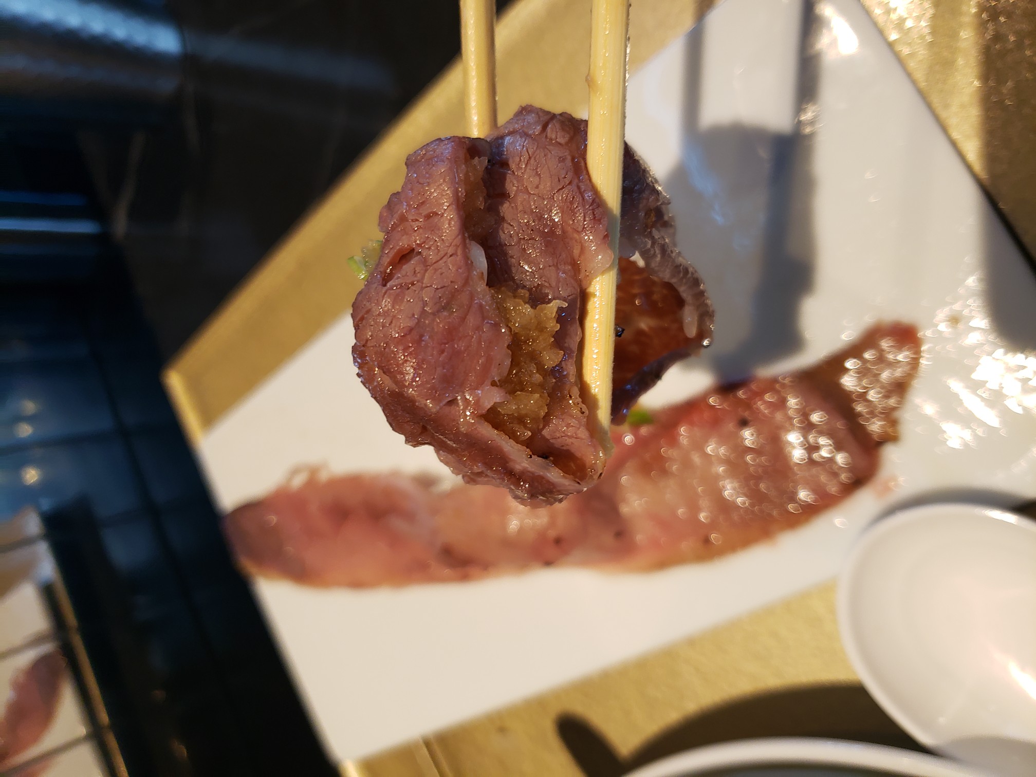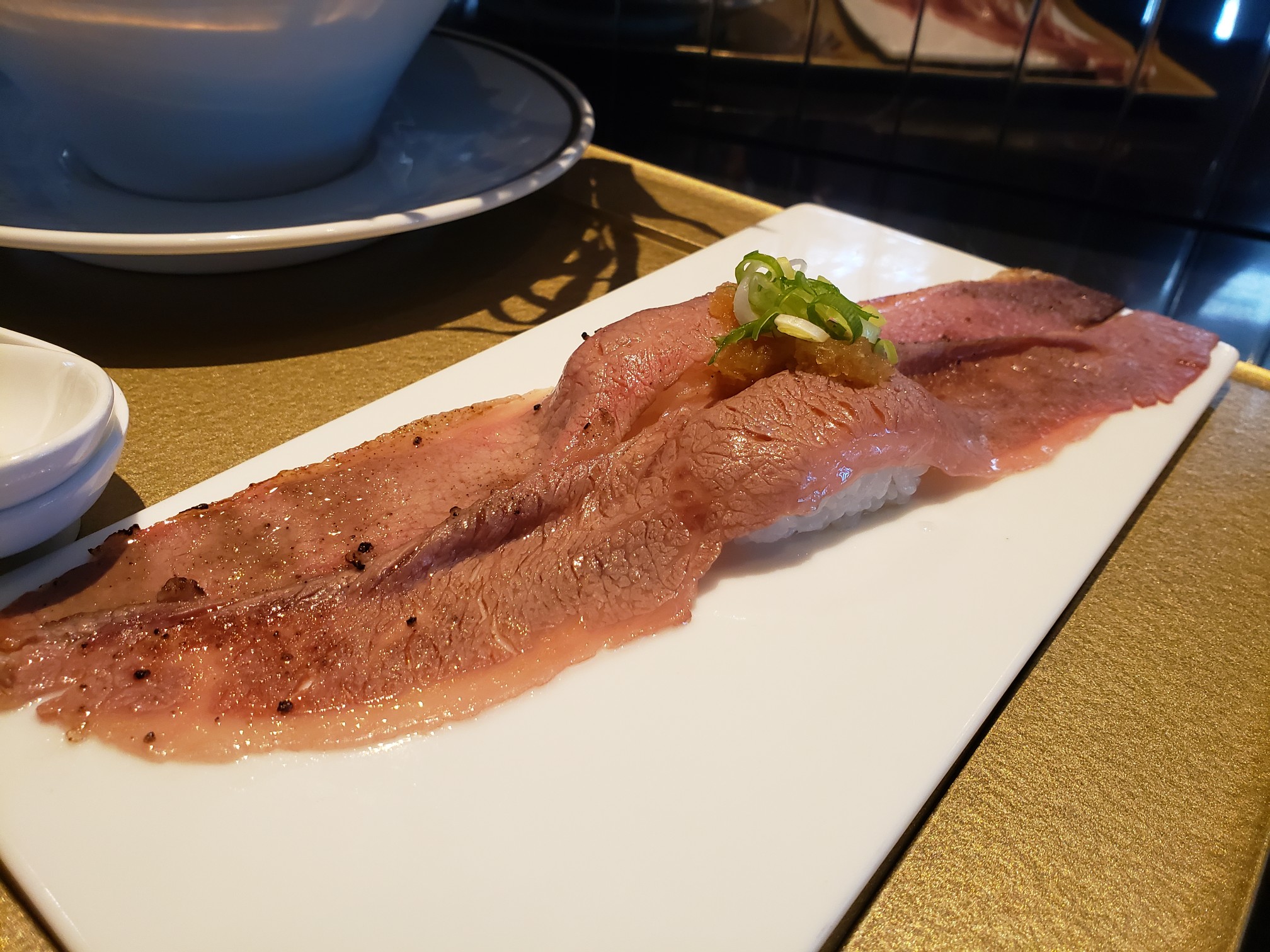 薄く延びた肉寿司の肉は上質。とろける感じ。大人気のサイドメニューだ。