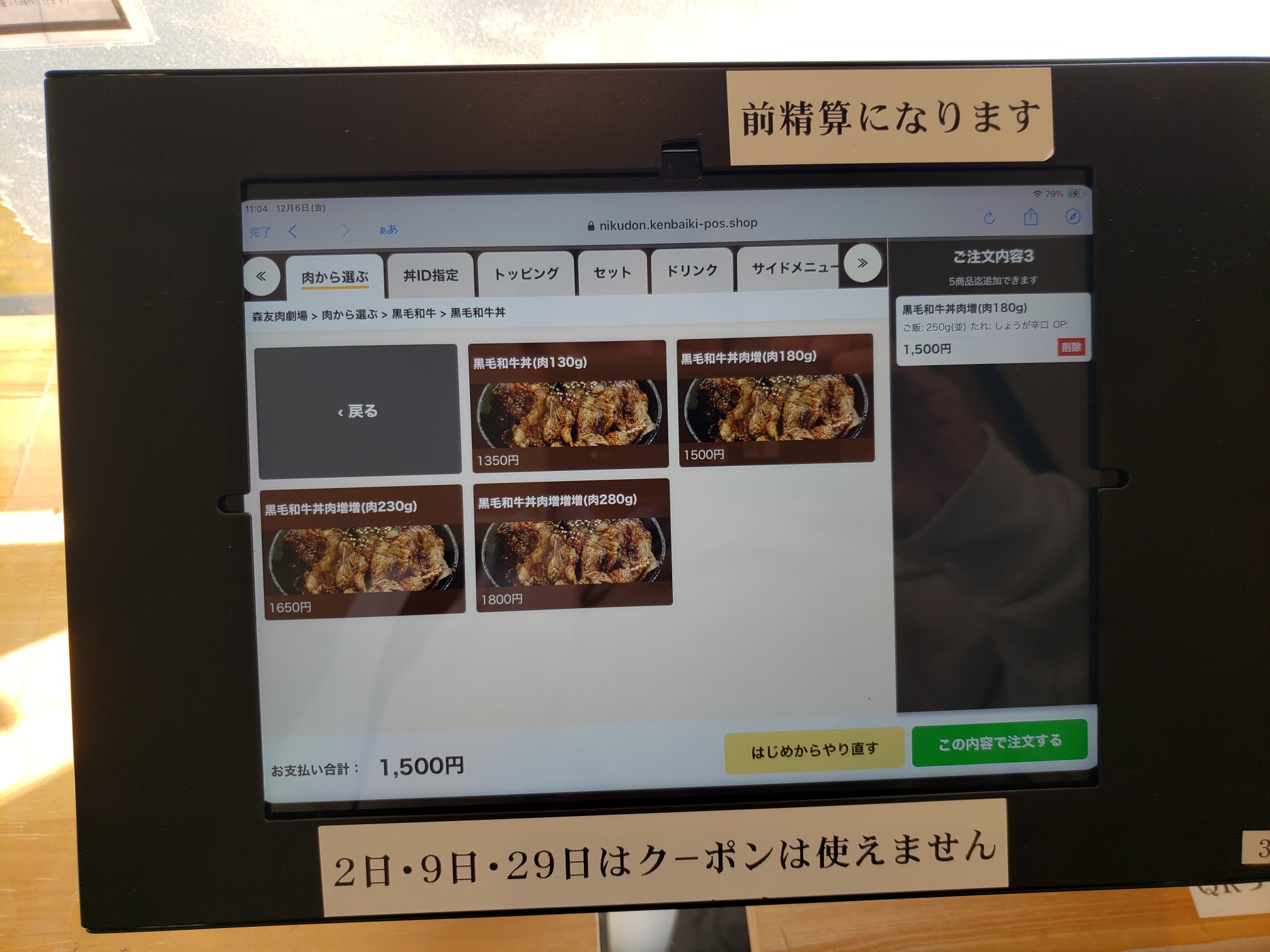 数々ある肉丼の中から、黒毛和牛丼(肉増180g)をチョイス。