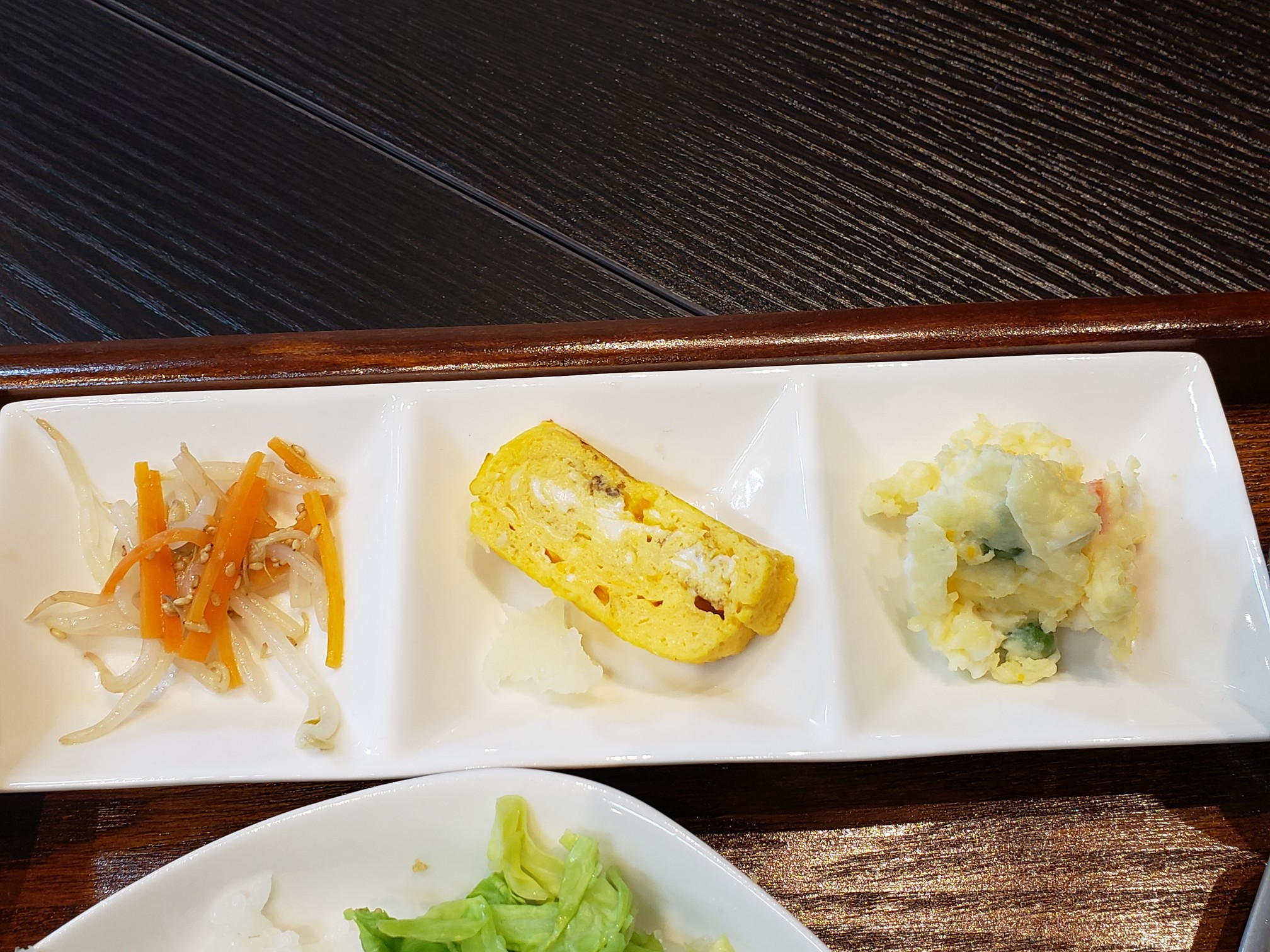 お惣菜3種、左からもやしナムル、玉子焼き、ポテサラ。うんまい!