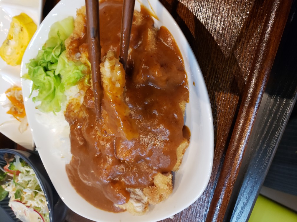 チキンをしっかり伸ばしてあるので、幅広いチキンでボリューミー。デミグラスはトマト系であっさり、うんまい!