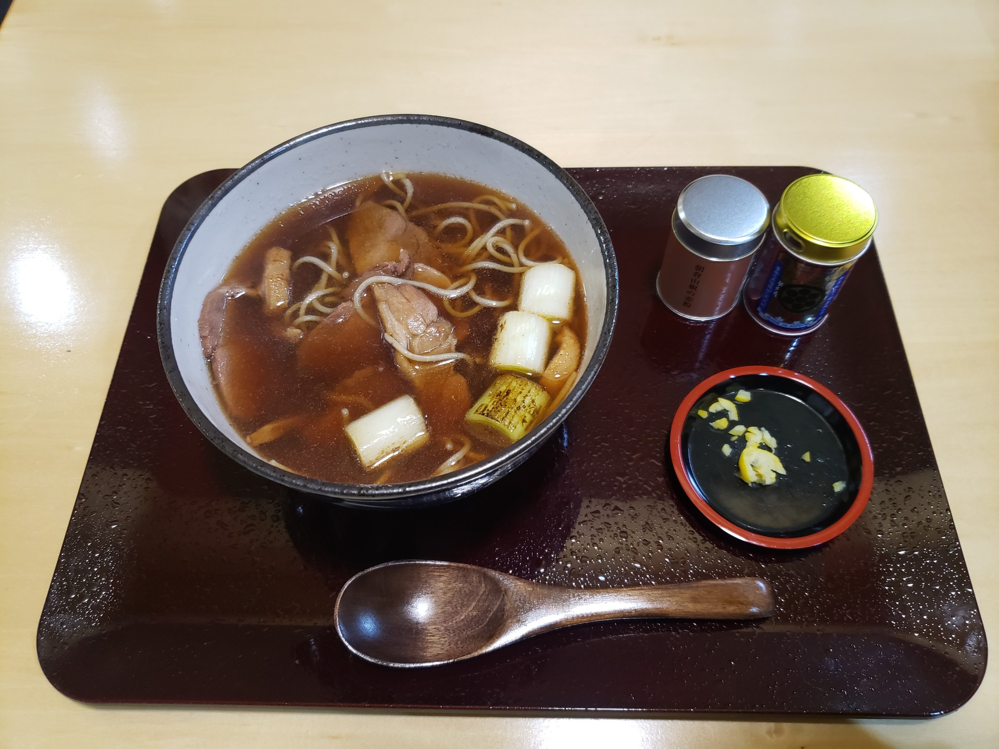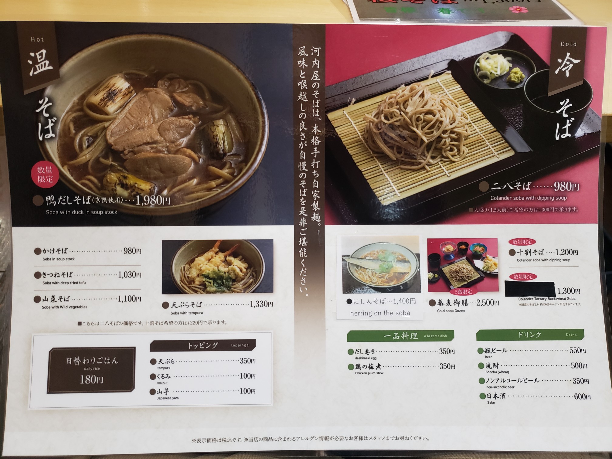 メニュー物色。ちょっと高級目なお蕎麦が並ぶ。今回は「鴨だしそば温」をオーダー。1,980円はなかなかのお値段だ。