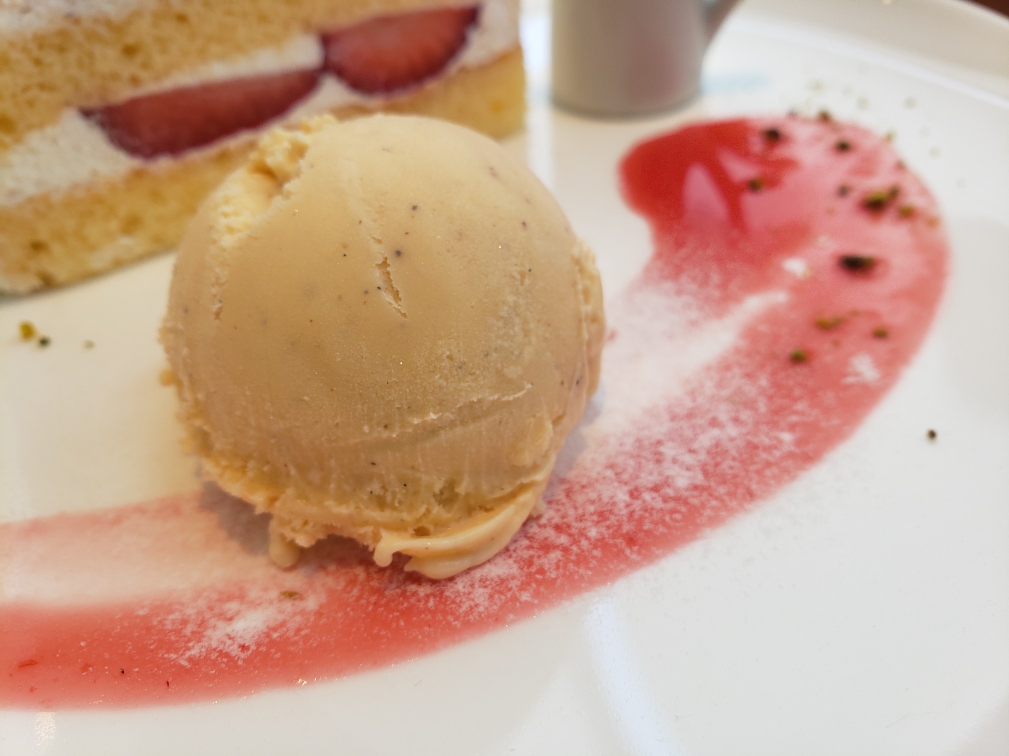 配膳タイム!イチゴソースとアイスクリームでデコレート。うまそー!