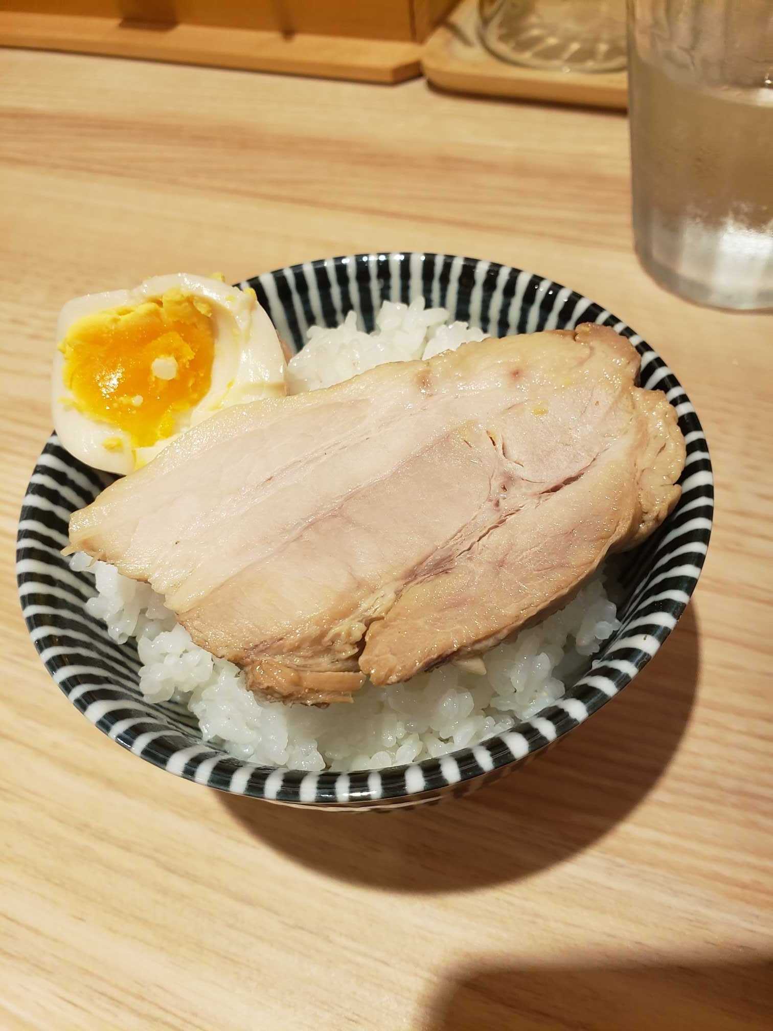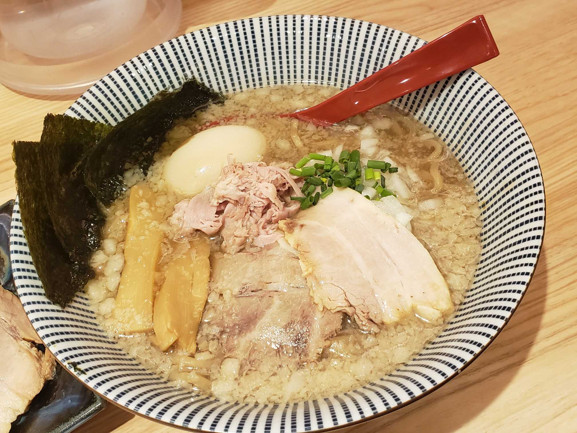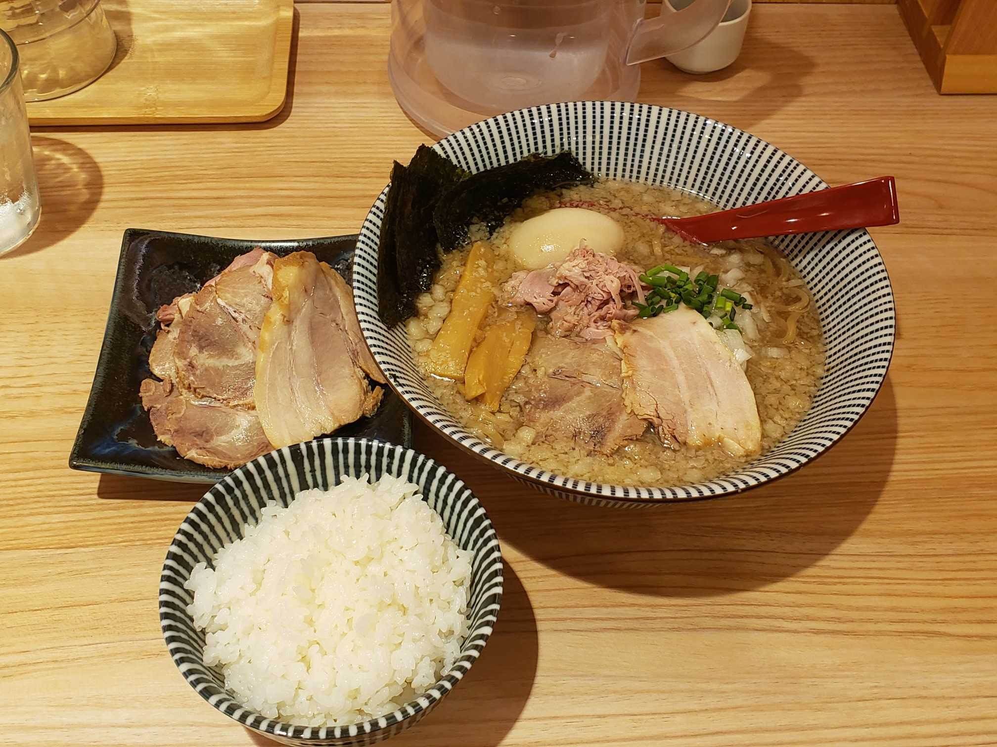 配膳タイム!今回は特製背脂煮干し醤油ラーメン+チャーシュートッピング+小ライスをオーダー。