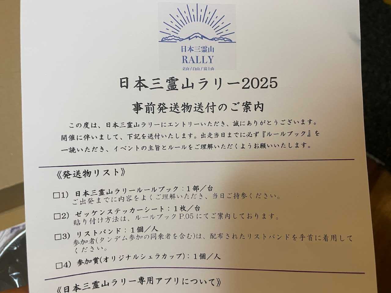 ライドのグッズが届いたライドのグッズが届いた。どんなものが入っているのだろうか?事前発送物 発送開始のお知らせ順次準備をすることにしよう。こちらのイベントは、「日本三霊山ラリー2025」日本の3大霊山を巡るライド。これから、ルートを考える予定だ。ありがたいことに立ち寄りポイントがアップされた。■■■■■■■■■■■■■■■■■■■■■立ち寄りポイント一覧▶ https://www.round4poles.com/post/threesummit2025-info0918■■■■■■■■■■■■■■■■■■■■■早速、計画をたてられるぞ!ライドに向けて、荷台の準備、ナビを改善する予定。とても楽しみ。いざ開封!!!開封してみたところ、こんなものが入っていた。記念シェラカップ驚きポイントは、シェラカップが結構肉厚。重みもしっかりある。ステンレス製。メモリが容量プラス、米の量も計れるところがナイス。リストバンドイベント参加の必須アイテム。今回は、青ね。いい色だこと。ルールブックルールをしっかり読み込んでおこう。ルートもはっきりさせておいた方が良い。ゼッケンナンバーシール早速、貼ろう。貼る場所は、正面とサイド。貼ると気分があがるよね!開催まで1ヶ月を切った。開催まで1ヶ月を切った。準備を進めていこう。まずは、ステッカー。オイル交換や点検も出そうかな。荷物の準備もしていきたい。ついでに練習もしておこう。やりたいことがいっぱいだ!!!★今回のまとめ★★日本三霊山ラリーのグッズが到着★だんだんとラリーの全貌が明らかに★準備をすすめていくことにしよう!!ブログランキングに参加しています。にほんブログ村にほんブログ村にほんブログ村 にほんブログ村いつもお得な情報をお届けこれからの季節にピッタリなキャンプ道具がそろってる。素材に使える写真がそろっている。自然を題材にした写真を多く投稿している。素敵な素材がみつかるかも!!!ふるさと納税、楽天ならふるさと納税で支払ってもポイントがつくのでその分お得。ワンストップなので、普段の買い物と感覚的には同じ。書類のやり取りだけで、申請を完了できる。ディズニーランドから近いため、遅くまで遊べるし、朝早くから行くことができる。たっぷりディズニーの世界を満喫できる。公式ホテルならお土産もディズニーのお土産コーナーだから買い逃してしまっても安心。日帰りから海外旅行まで直前まで選べる・予約できる楽天トラベル。自分にあったプランを選ぶことができるので、とっても便利。クレジットカードの満足度ランキングでも常にトップに君臨しつづけている楽天カード。その理由はポイントが貯まりやすいから。特に楽天ユーザーなら絶対にお得なカード。0と5のつく日に、楽天市場で楽天カード払いのお買い物をすることでポイントが5倍!充実したサービスながら 年会費無料!キャッシュレス還元で増税前よりポイントが貯まりやすくなっている。