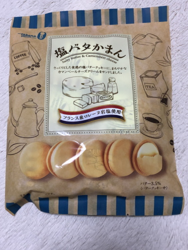 宝製菓 塩バタかまんなんか なまえがなんだろうって思ってパッケージの絵からしてかまん はカマンベールチーズだろうと思ったけど買ってみたクッキーにチーズ風味のクリームをはさんだお菓子フランスのロレーヌ岩塩って言われても('◇')ゞって感じではあるけど・・・・・クッキーはバタークッキーで厚みがあって食べ応えもあるボリュームさっくりとしたいい食感でクッキーだけでも十分おいしいの間にカマンベールを使ったチーズのクリームがほんのり塩が効いてる口にくわえた瞬間結構なチーズの香りがするので好きな人はうれしいだろうけど嫌いな人は食べたくないかも('◇')ゞ個人的にはなかなかうまいなとただ、クッキーを少し薄くしてチーズを厚くしてもいいのでは?と思ったけど5点中 3.8点