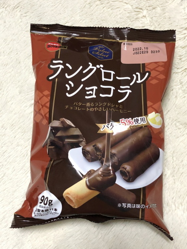 ブルボン ラングロールショコラパット見、バームロールに似てるかな?って食べてみたけどバームロールはどっちかというとふんわり柔らかいのを巻いてあるけどラングロールショコラは薄いクッキーみたいなのを巻いた感じそうラングロールのラングはラングドシャからつけられた名前ラングドシャといえば薄くさっくりとしたクッキーとし人気があるチョコと合わせたのも多いけどブルボンは、それを巻いて外側からミルクチョコレートで巻いちゃった~ラングドシャにはバター5%配合で焼き上げてあるお菓子ミルクチョコの甘さとバターの風味とサクサク食感がなかなかおいしくできてるさすが、こういうのはブルボンはいい5点中 4.0点かなぁ