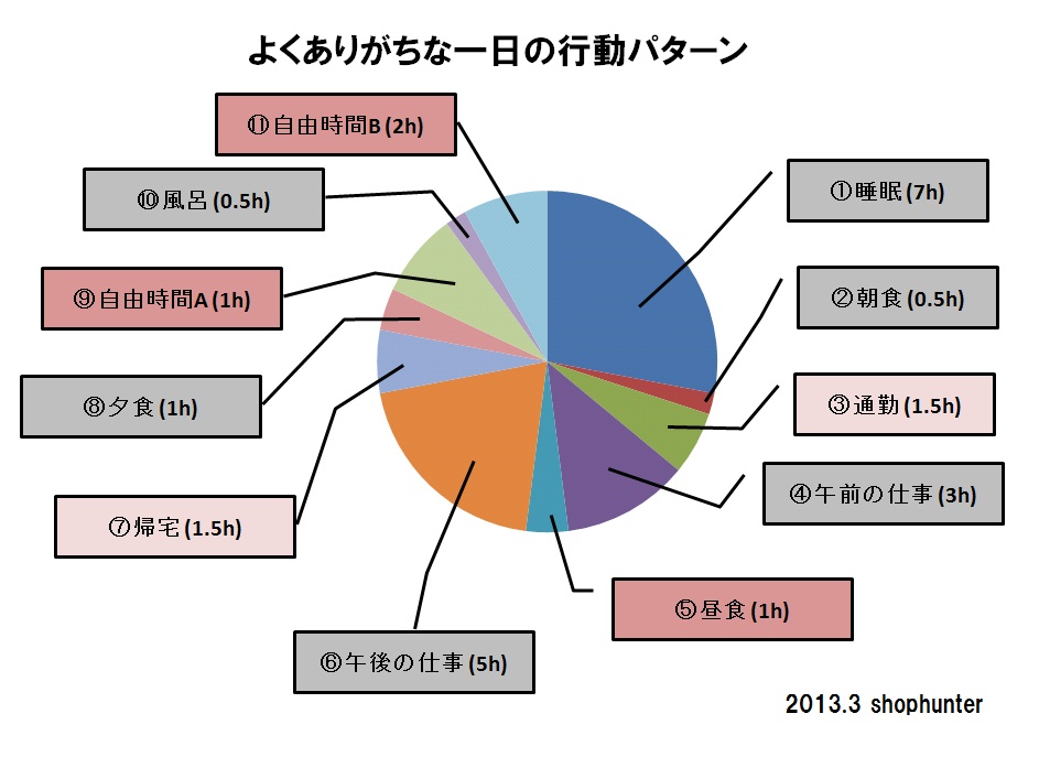 たとえば、片道の通勤時間が 1時間半、一日 8 時間の労働条件で働く社員によくありがちな一日の行動パターンを円グラフにすると、以下のようになります。