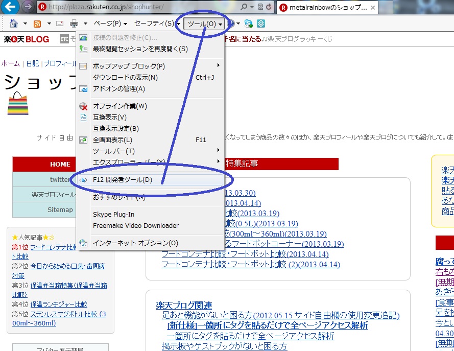 1. ご自身の楽天ブログページを表示させた状態で、下図のように「ツール」→「F12 開発者ツール(D)」の順に選択します。