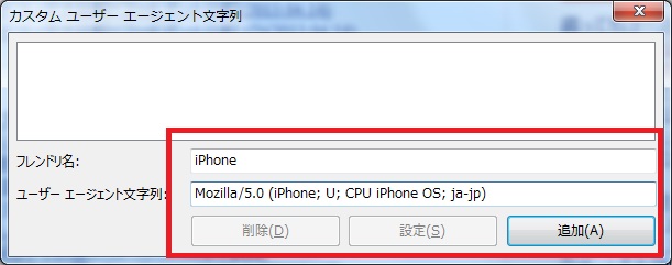 たとえば、iPhone 用のユーザエージェントを追加する場合は、下図のようになります。