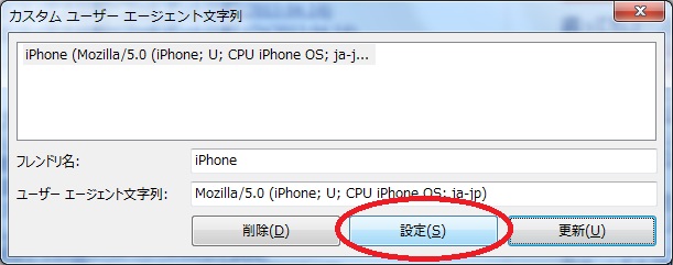 入力が終わったら、「追加」ボタンをクリックして、続いて「設定」を押すと、User Agent 設定が有効になります。