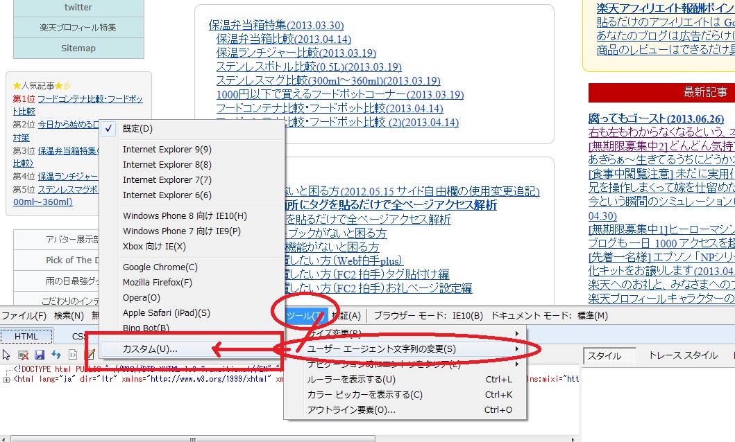 下図のように、「ツール(T)」→「ユーザ エージェント文字列の変更(S)」→「カスタム(U)...」の順に選択します。