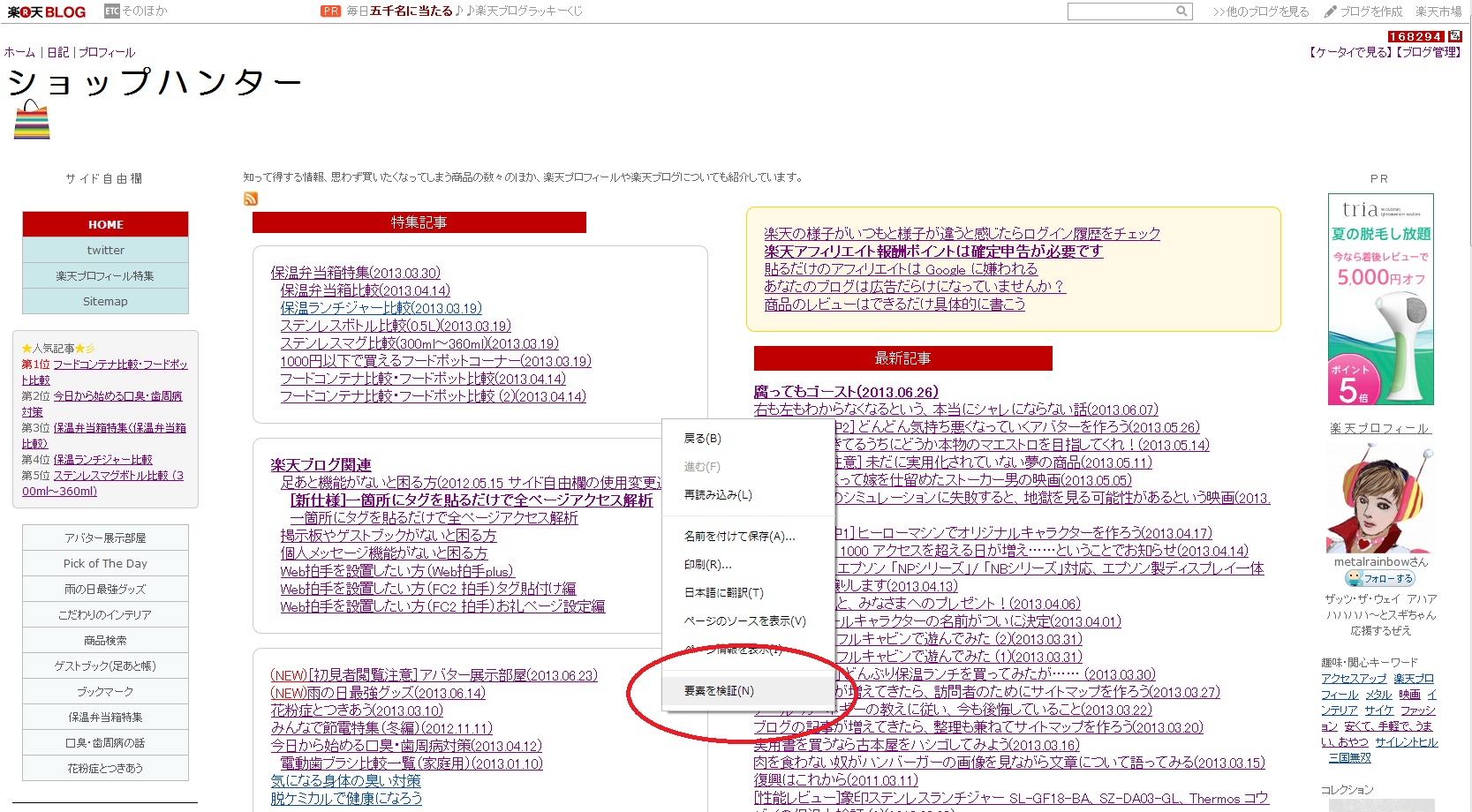 1. ご自身の楽天ブログページを表示させた状態で、マウスを右クリックすると、Google Chrome のサブメニューが開きます。