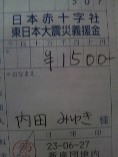遅くなりましたが、5月レッスン料の10%を、東日本大震災義捐金として日本赤十字社へ寄付してまいりました。ゆうちょ銀行の窓口からなら手数料無料で振り込めます。今回は専用用紙もできていて、楽でしたコンビニから簡単に寄付できる方法は、以前の日記をご参照くださいhttp://plaza.rakuten.co.jp/shusshu/diary/201105160000/