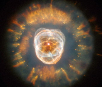 2000年にハッブル宇宙望遠鏡はエスキモウ星雲を写しだしました。宇宙からではこの星雲はあまりに複雑なガス雲を見せており、よく分かっていません。エスキモウ星雲は明らかに惑星状星雲で、上に見えているガスは、一万年前は太陽のようだった、星の外層部を構成していました。